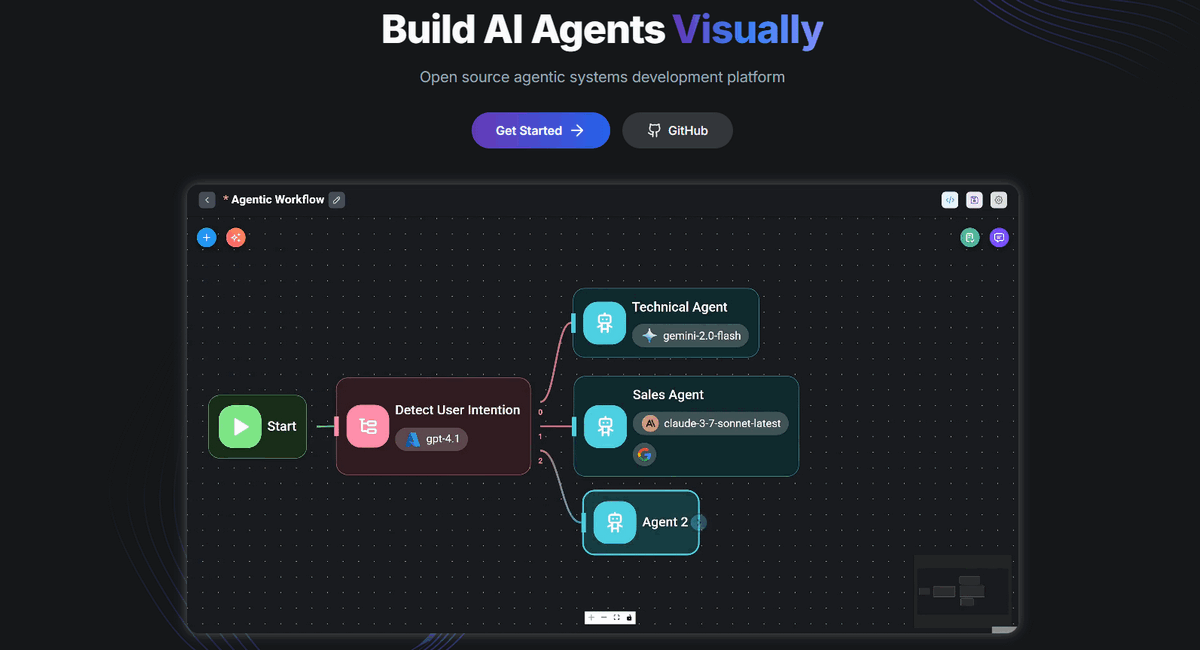 - Visual AI agent builder: drag-and-drop interface for building multi-agent systems with native AI nodes including tools, memory, structured outputs and more.