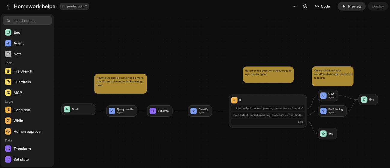 When to use: visual workflow building with OpenAI ecosystem integration – suitable for teams wanting a drag-and-drop builder, with managed hosting or Agents SDK code export.