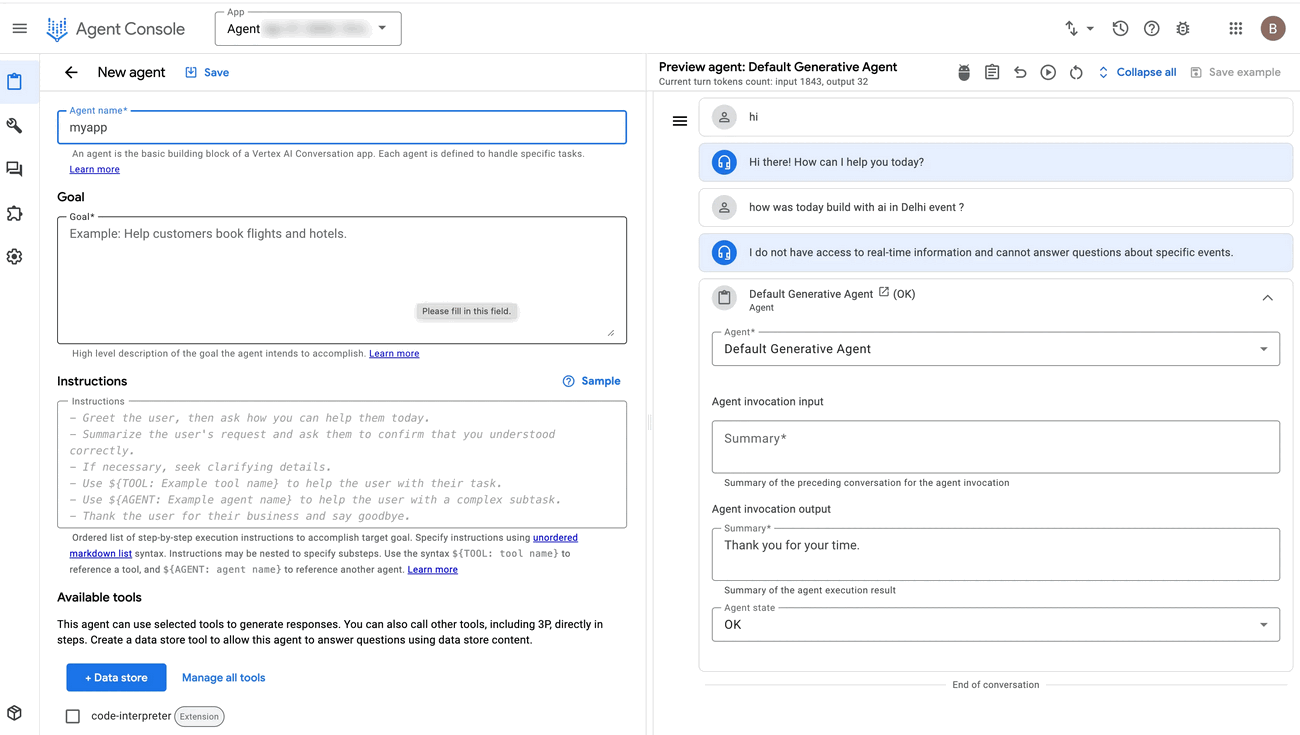 - No-code development: visual interface for assembling conversational agents (based on the agents pre-built with ADK)