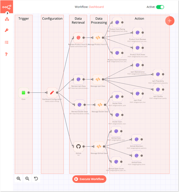 In this article, we will pull information from GitHub, Docker, npm, and Product Hunt about the n8n project and then display it using a Smashing dashboard. Since this information is constantly changing, n8n will perform this every minute. The workflow for this project looks something like this: