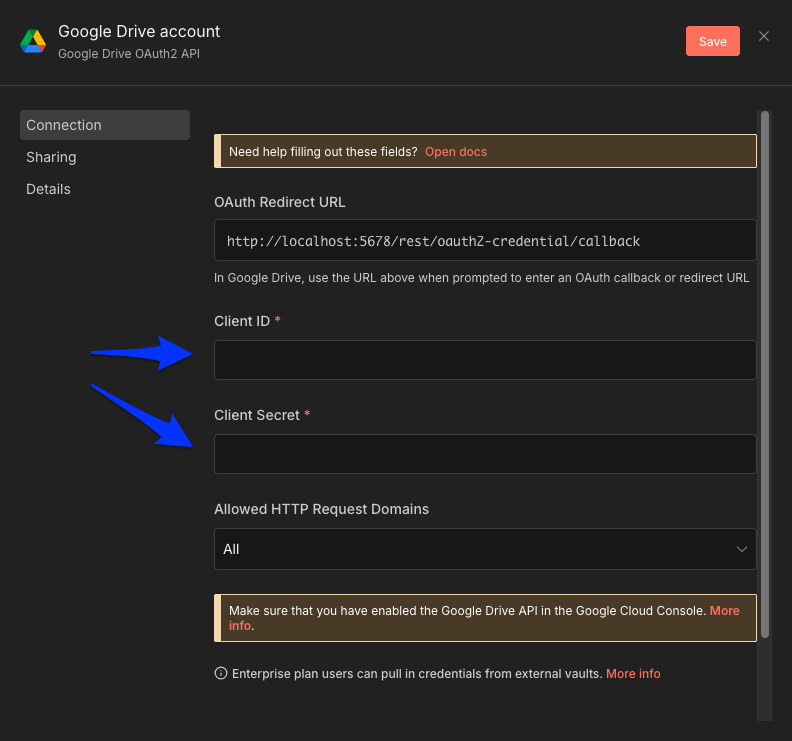 - Back in your n8n workspace, paste in the Client ID and Client secret from step 10