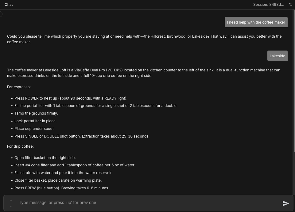 Notice how the response requests more information about which property the guest is referring to. This happens because in our System Message, we've instructed the model to ask for more information from the guest if it cannot infer the property from the original message.