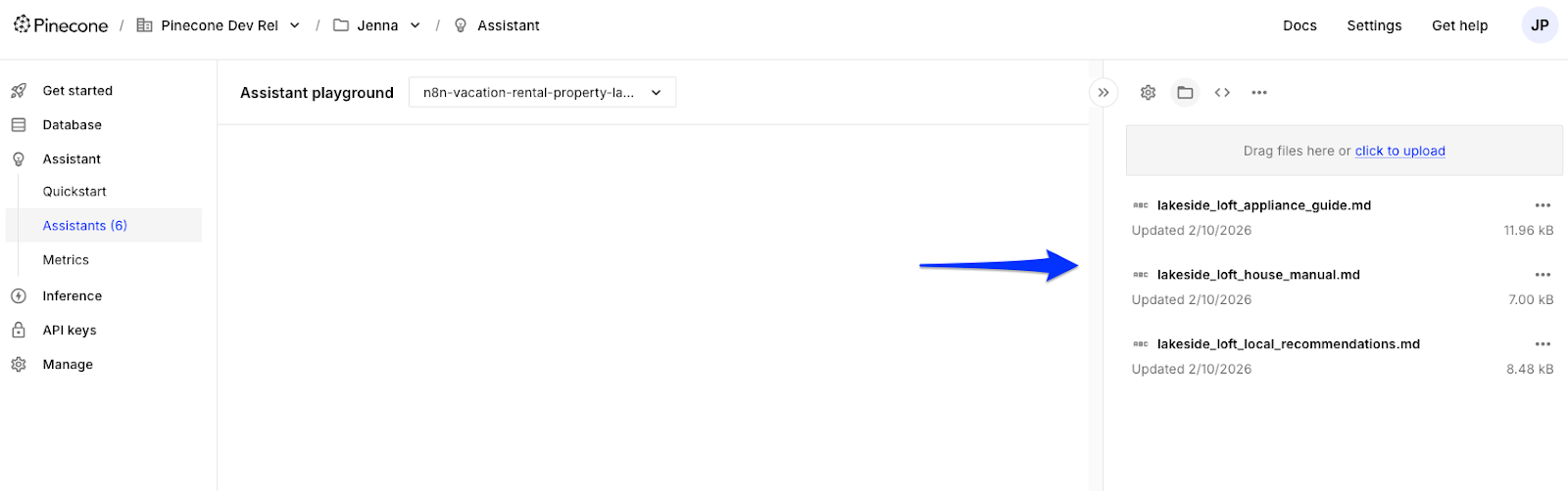 - Go to the Pinecone Console and verify each assistant's files have been uploaded.