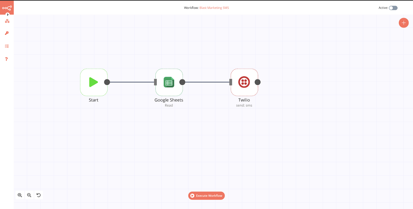 I have also built a similar workflow “Blast Marketing SMS” to help my coworkers to send marketing text messages without my help. It consists of two nodes, GoogleSheets node and the Twilio node. Whenever they want to send SMS to our customers, they fetch the customer from our internal tool, which returns an CSV file (with the phone numbers and metadata). Once this CSV file is uploaded to GoogleSheets, they configure the SMS on the Twilio node and to finalize just execute the workflow.