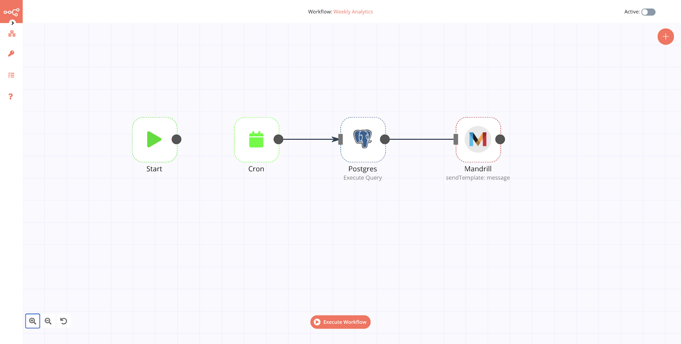 Yes, I have been using it to automate tasks for Klipped. Since I’m the only back-end developer there, I try to automate as much as possible. One of the workflows I used the most is ‘Weekly Analytics’’. It consists of a cronjob that runs every Monday, calls the Postgres node, and retrieves the records that meet certain criteria. It then calls the Mandrill node to send an email.