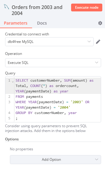 First, add a new MySQL node and provide the credentials for the db4free database: