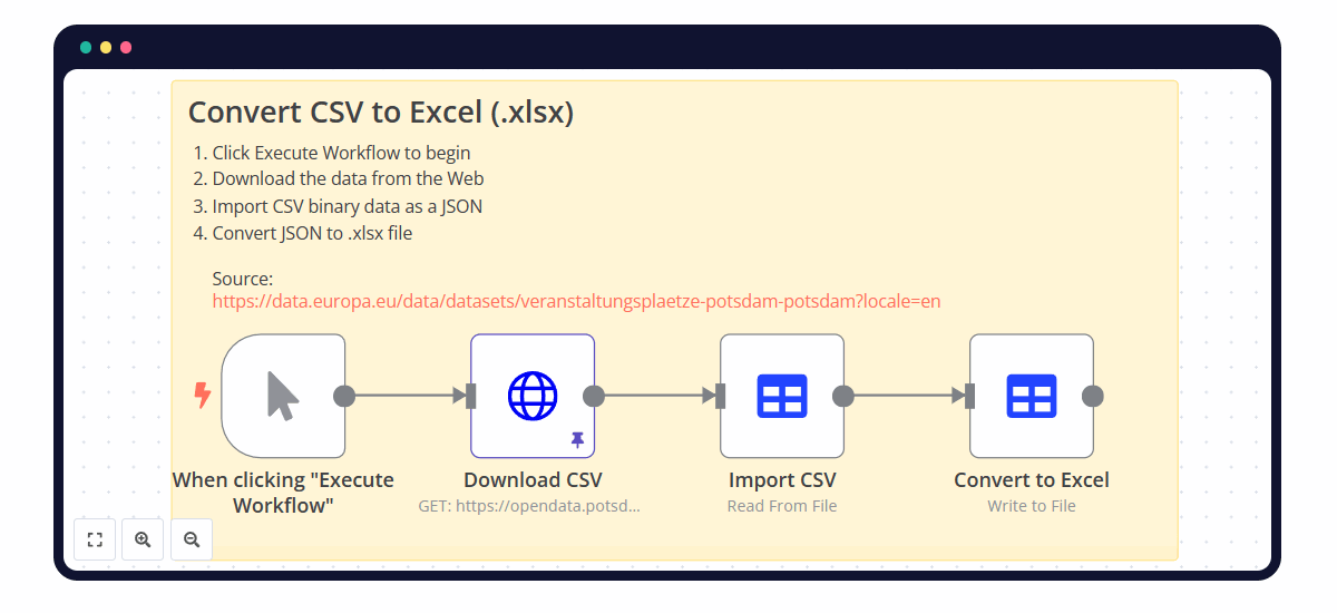Now, let’s consider the following automation scenario: the n8n workflow downloads a CSV from a URL and then converts it to an Excel file. This conversion commonly occurs when sourcing data from public databases or when an external system can only export data in CSV but not Excel format.