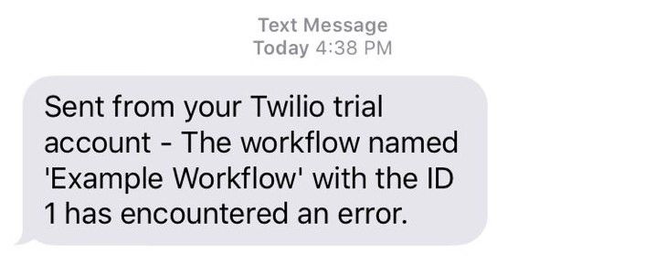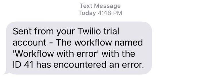 The workflow named '{{$node["Error Trigger"].json["workflow"]["name"]}}' with the ID {{$node["Error Trigger"].json["workflow"]["id"]}} has encountered an error.Click on the Execute Node button and that will send a message to the number specified in the node. Here’s a screenshot of how that looked for me.
