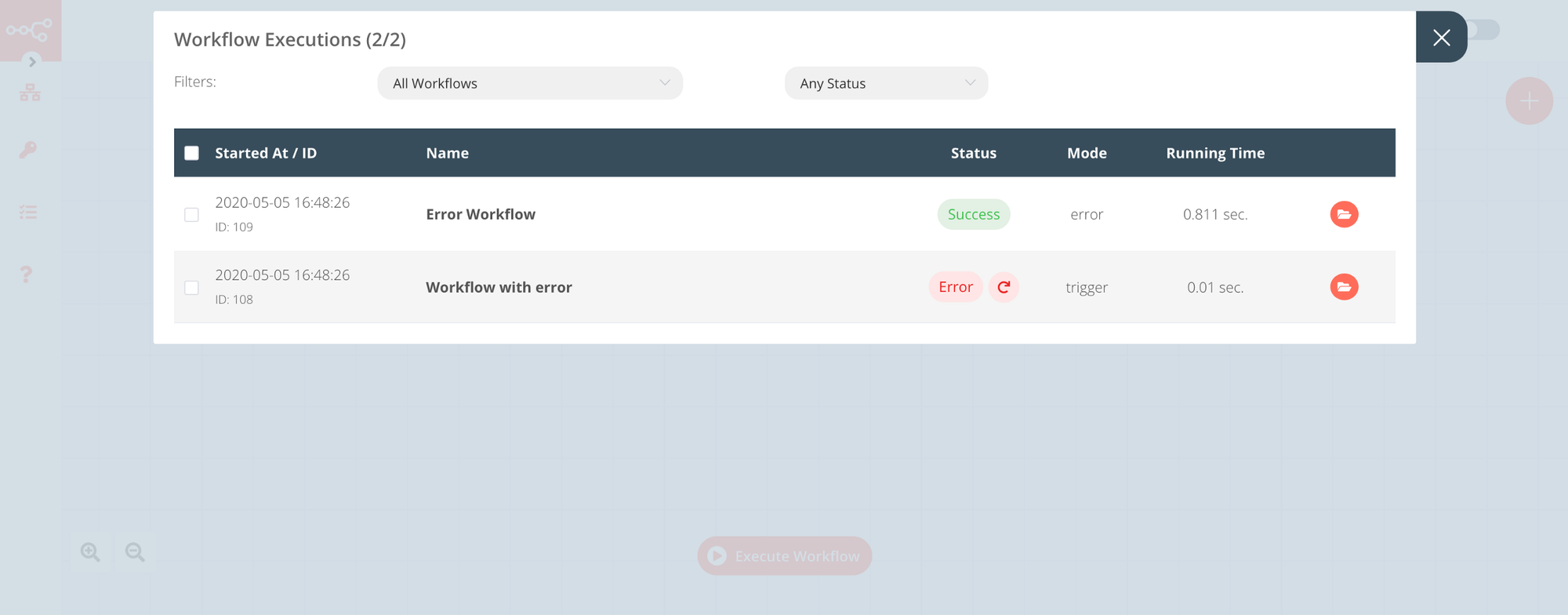 In this tutorial, I’ll teach you how to create an error workflow and use the Error Trigger node. We’ll create two workflows (these workflows were built using n8n@0.111.0) in this tutorial to learn about error workflows: