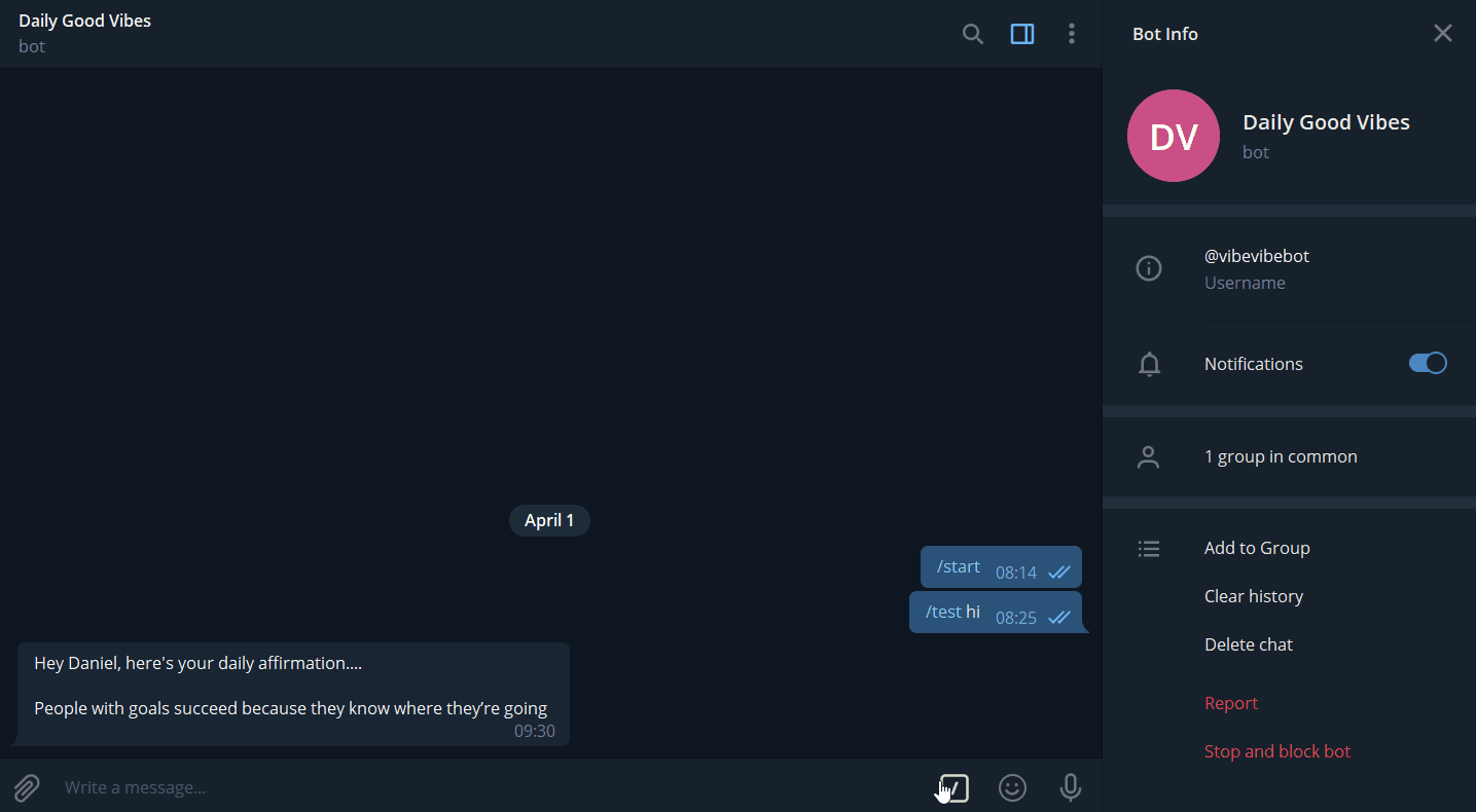 Check your Telegram and you should have a new message from your Daily Good Vibes bot.