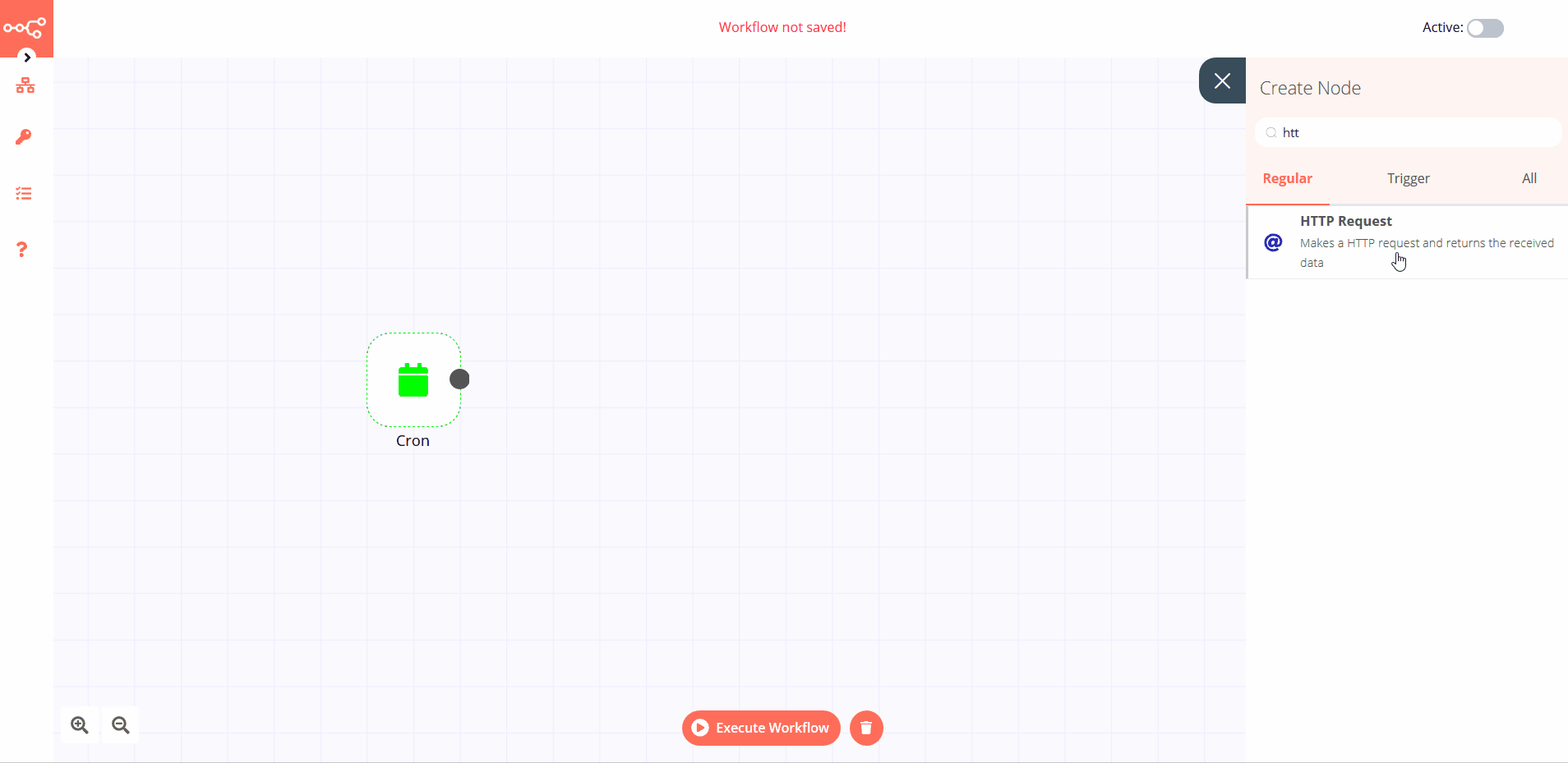 Again, we click the + in the top right corner and search for HTTP and click on the HTTP Request node. Paste https://affirmations.dev in the URL section and execute the workflow. Successfully runs again but this time you get some data, which is always good when making a request. Close the modal. Click and hold the circle on the Cron node and drag it to the left side of the HTTP Request node. This way, we’re telling n8n that when the Cron node is triggered, we need to make a request and return some data.