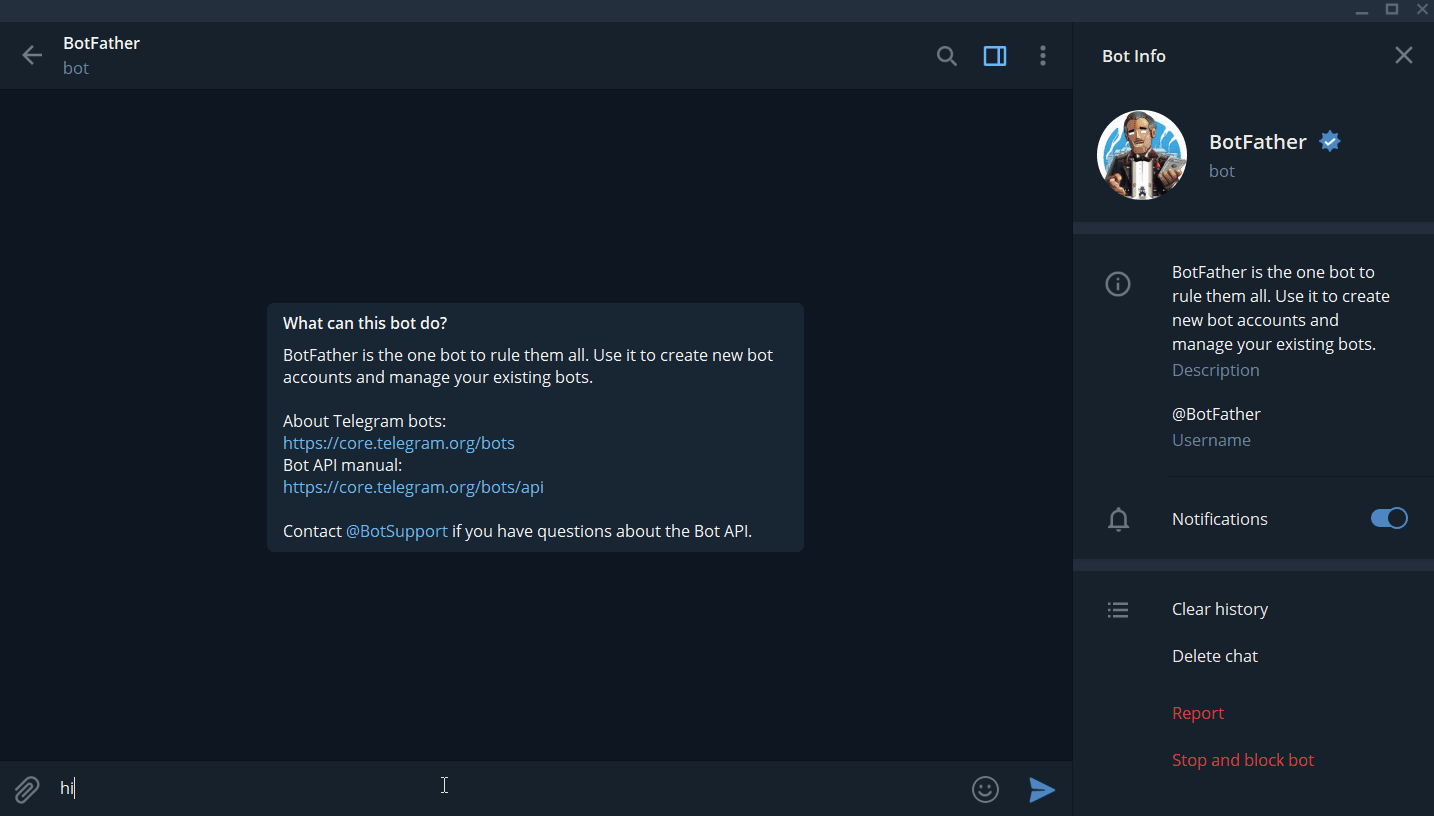 - Here, you give your bot name and unique username and get back a URL that directs you to the bot and token to access the bot via HTTP, we need to keep this safe. Click on the bots URL (t.me/<bot username>) and press start when taken to its chat window.