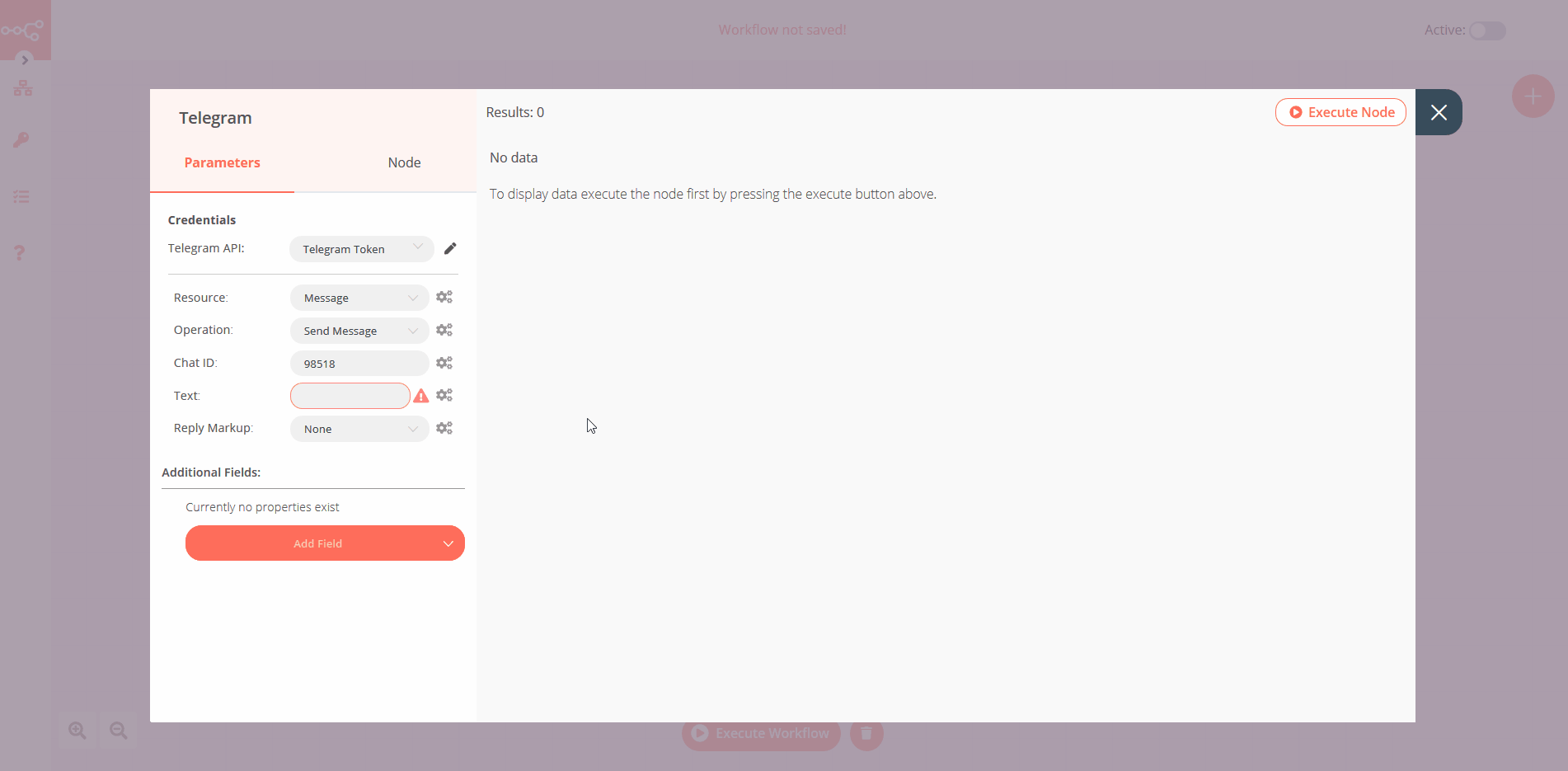 Add your Chat ID and made sure all other credentials in the Telegram field have been filled. We’ll leave the chat operation as send message because that’s what we’re going for. Close the node and click on the Execute Workflow button.