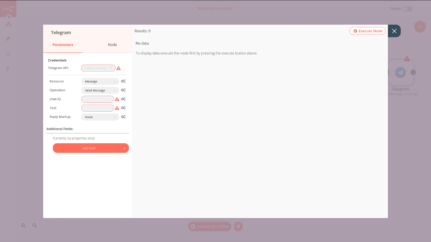 There are a few fields highlighted and we don’t have that data yet. So before we use the Telegram node, we have to get those details. Here’s what we need to do: