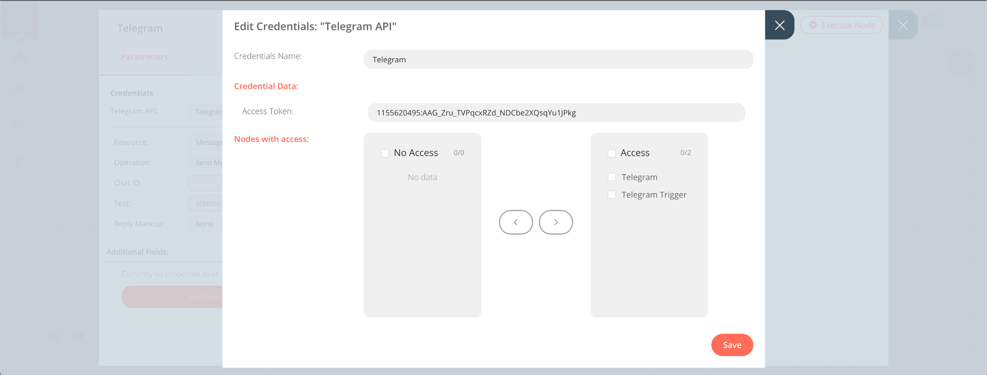 Now it’s time to configure the node. We already have the Telegram credentials that we entered early on and they can be re-used. Once you have selected the credentials, click on the pencil icon next to the credentials and make sure that you move the Telegram node from No Access column on the left to the Access column on the right. Once you are done with that, it should look like this.