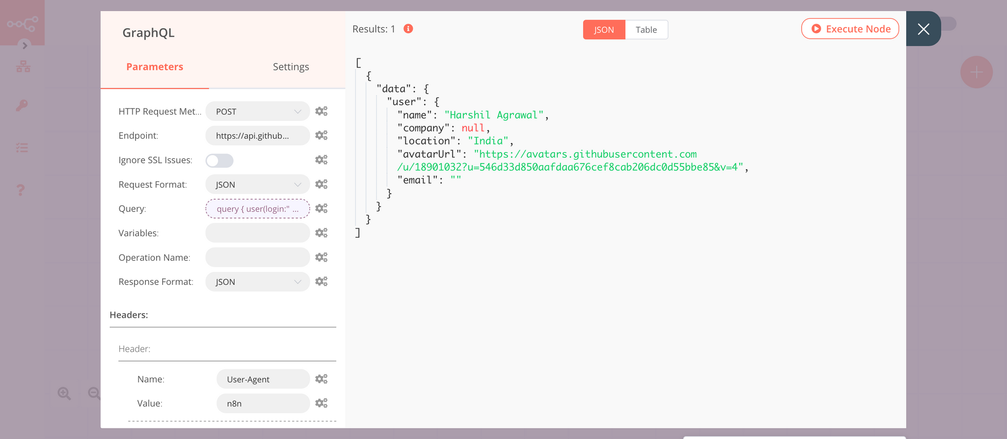n8n has a GraphQL node which can be used to execute GraphQL queries. We will use GitHub’s GraphQL API in this node to get the contributor’s information.