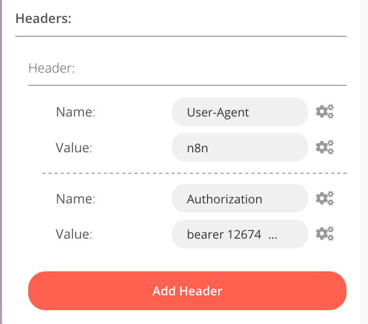 The GitHub GraphQL API requires two headers for running any queries. The first header we will add is the User-Agent header. Click on Add Header in the Header section. Enter User-Agent in the Name field, and n8n in the Value field. Add another header for Authorization. Enter Authorization in the Name field. The value for this header will be in the following format:bearer <GitHub-Personal-Access-Token>