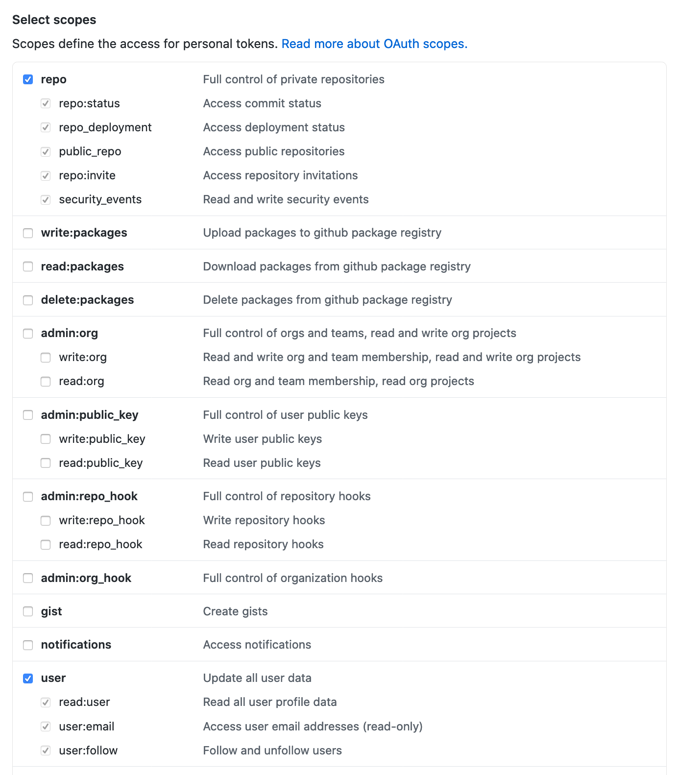 Note: While generating the GitHub Personal Access token, make sure to select repo and user under the Select scopes section.