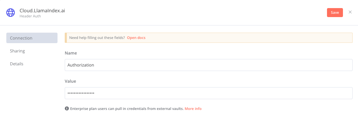 Once you have the LlamaParse API key, create a Header Auth Credential that we will use when making calls to the LlamaParse API in our n8n workflow.