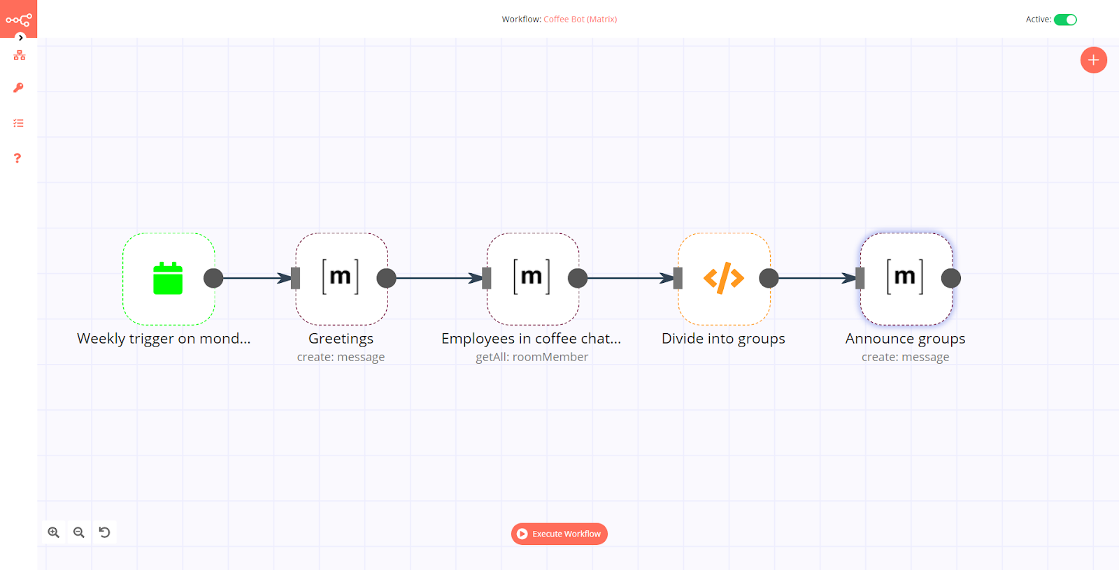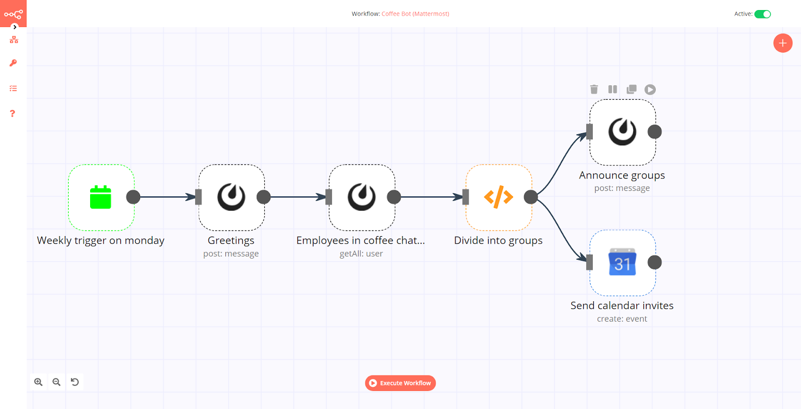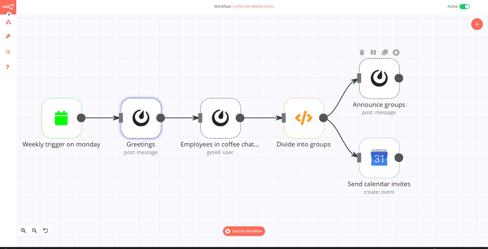 You can test your latest Mattermost node by clicking the Execute Node button at the top right corner. If this worked properly, you will be able to see the coffee groups appear in the appropriate Mattermost channel. You can rename the Mattermost node to Announce groups and close the node.