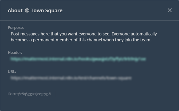 If you are not sure what the channel ID is for your Mattermost node, simply go to the title of the channel in the Mattermost page, click on the down chevron, and click on view info. This will pop up a new window telling you about your channel the channel ID is in fine print at the bottom left-hand corner of the window copy and paste this long string of letters into the channel ID field in the Mattermost node window.