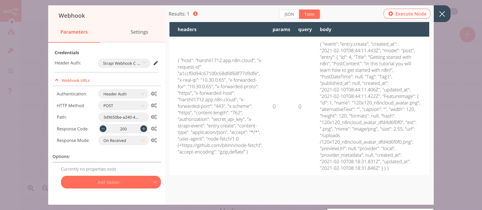 First, create a sample post and retrieve the data model from Strapi. Click on the Execute Node button and then create a new sample post in Strapi. It should look something like the image below.