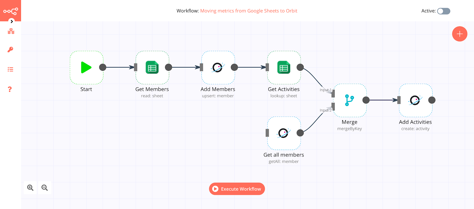 Our workflow will fetch the data of our community members and their activities from a Google Sheet and add the information in our Orbit workspace automatically. The workflow uses the following nodes: