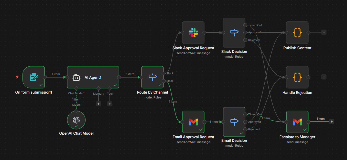 Import the Exercise 3 template to your instance to explore this example of a multi-channel content approval with Slack and email escalation. This template includes a Form Trigger, an AI Agent for content enhancement, Switch-based routing to Slack or Email approval nodes (with built-in Approve/Reject buttons and configurable timeouts), three-way decision routing (approved, rejected, timed out), and a timeout escalation path to a manager via email.