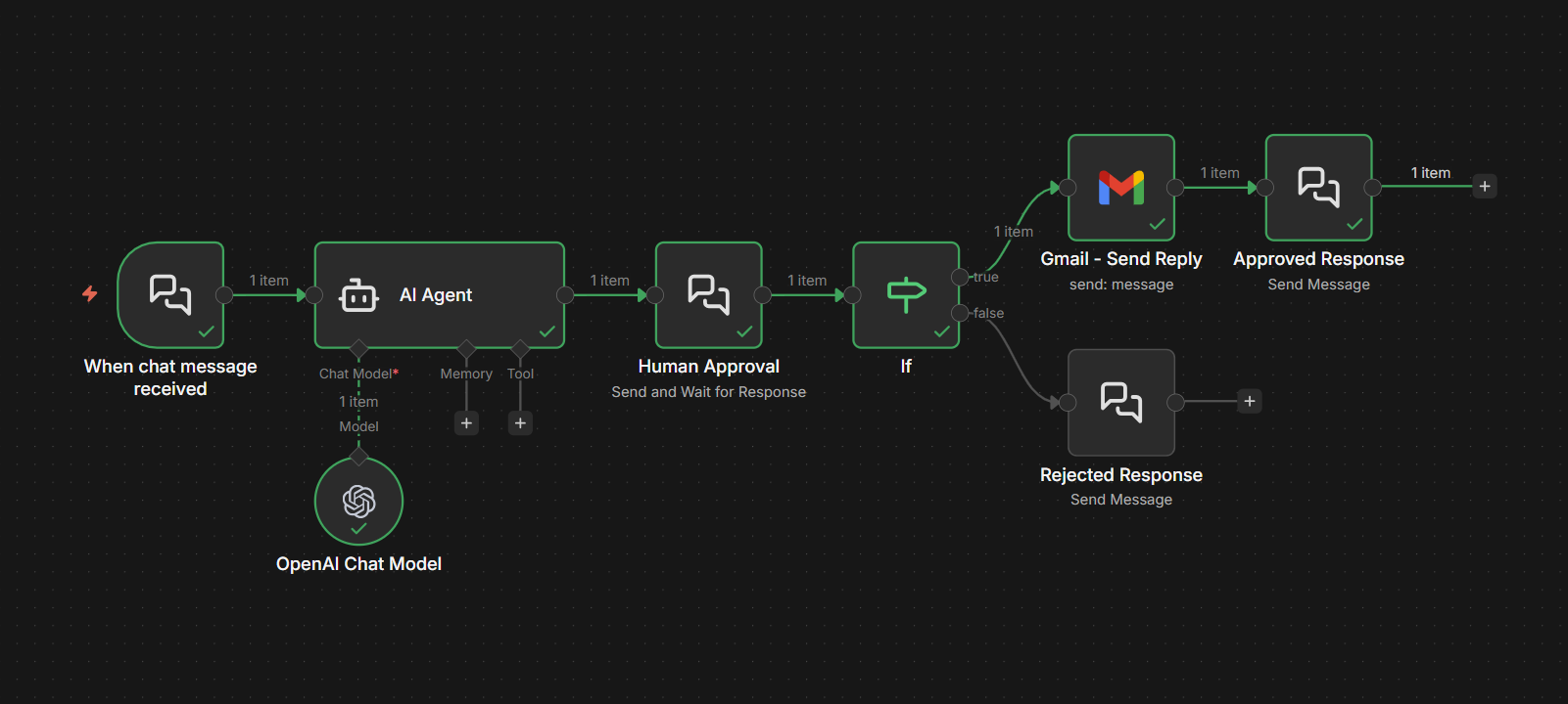 Step 4: Branch based on the decision. After the Chat node, add an IF node that checks the approval result. If approved, the workflow proceeds to send the email. If rejected, you can route back to the AI with revision instructions or flag it for manual handling.