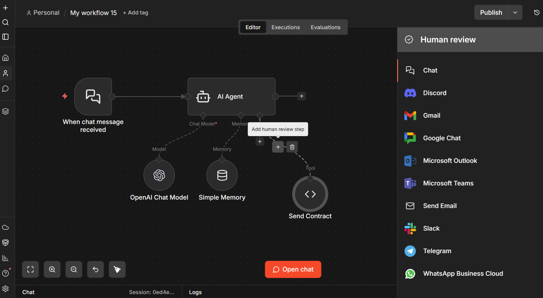 Several other integrations, like Slack and Telegram, have similar functionality, but we'll walk through a concrete example using n8n's built-in Chat node.