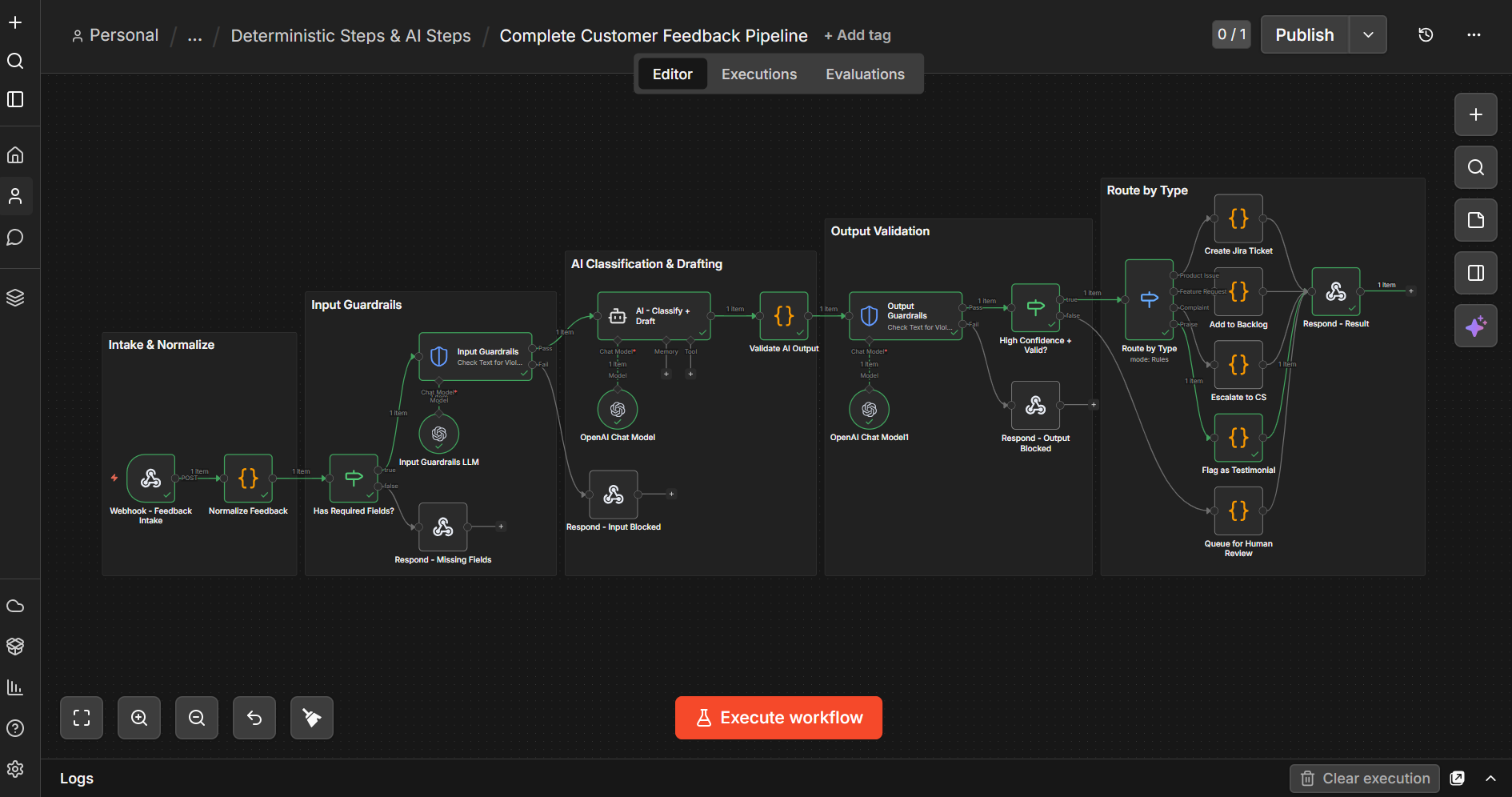 | Conditional routing | Branching logic using nodes like IF or Switch to route data based on conditions or AI outputs. |