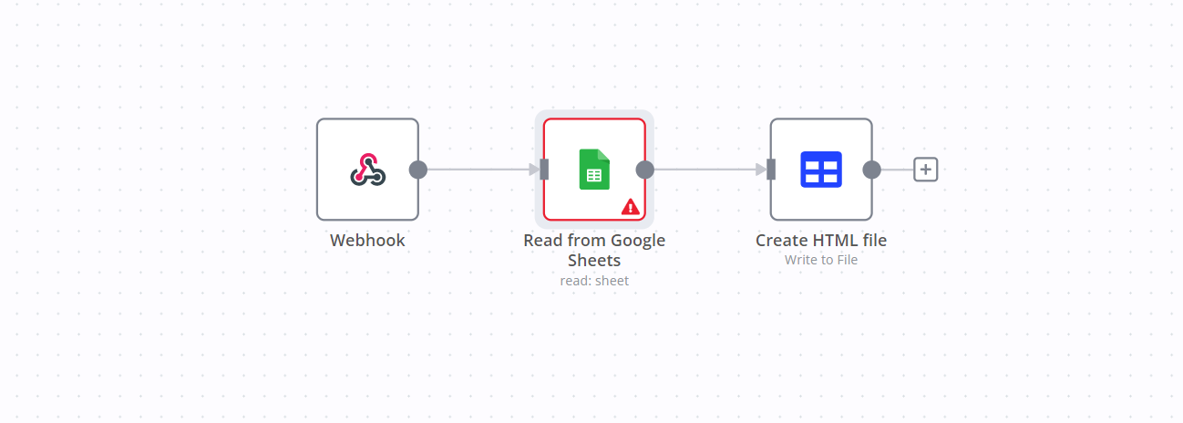 While the Google Sheets and Create HTML nodes are self-explanatory, the webhook node might not be for first-timers. You can wrap your mind around the basics of webhooks here. And then you can take a more in-depth look at the webhook node here.