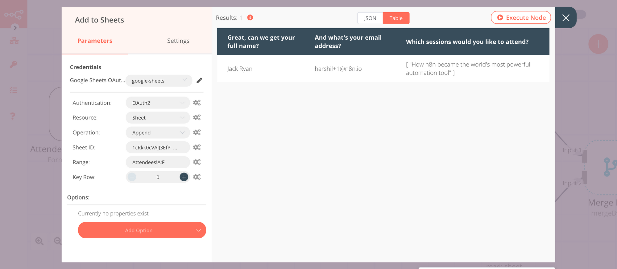 To share the meeting information and time, I scheduled events with Google Meet links on Google Calendar for each session. This Google Calendar node adds the attendees to the appropriate Google Calendar events for their sessions.