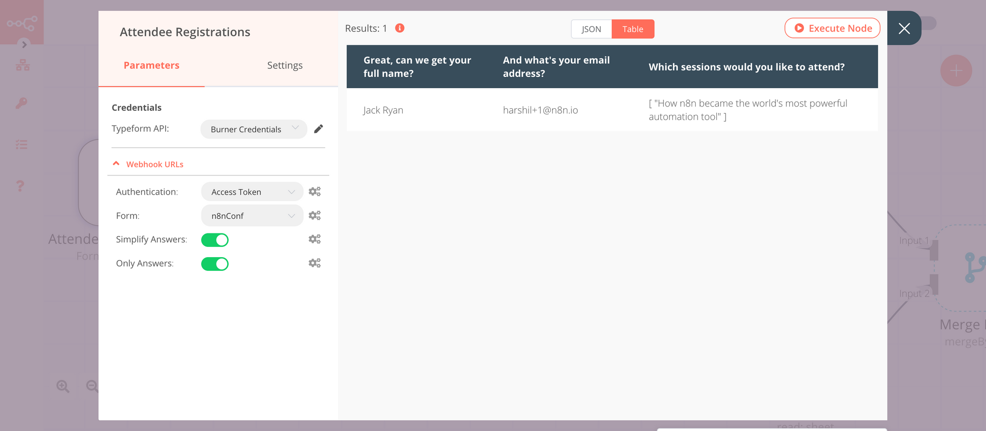 At this stage, we have all the data we need and a ready-to-use Mattermost account for your attendees. Typeform returns the attendee registration data as an array of values in JSON string format. However, we need to make sure that the data is in a more usable JavaScript array format, as this is what n8n uses.