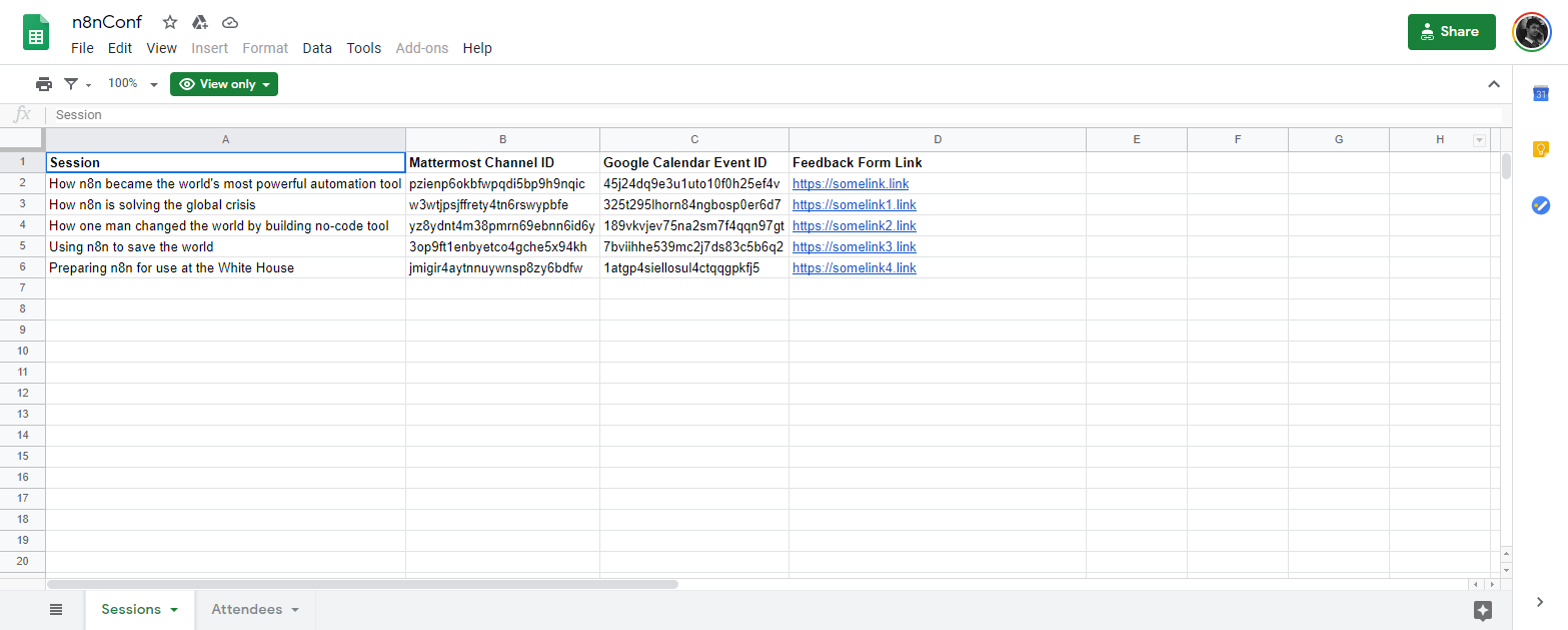 I wanted to be able to easily view and manipulate the information collected from the Typeform. I decided to use Google Sheets for this task. This Google Sheets document will also contain an additional spreadsheet in it (shown as a tab on the bottom) that we will use to store information about the Mattermost channels and Google Calendar events for each session.