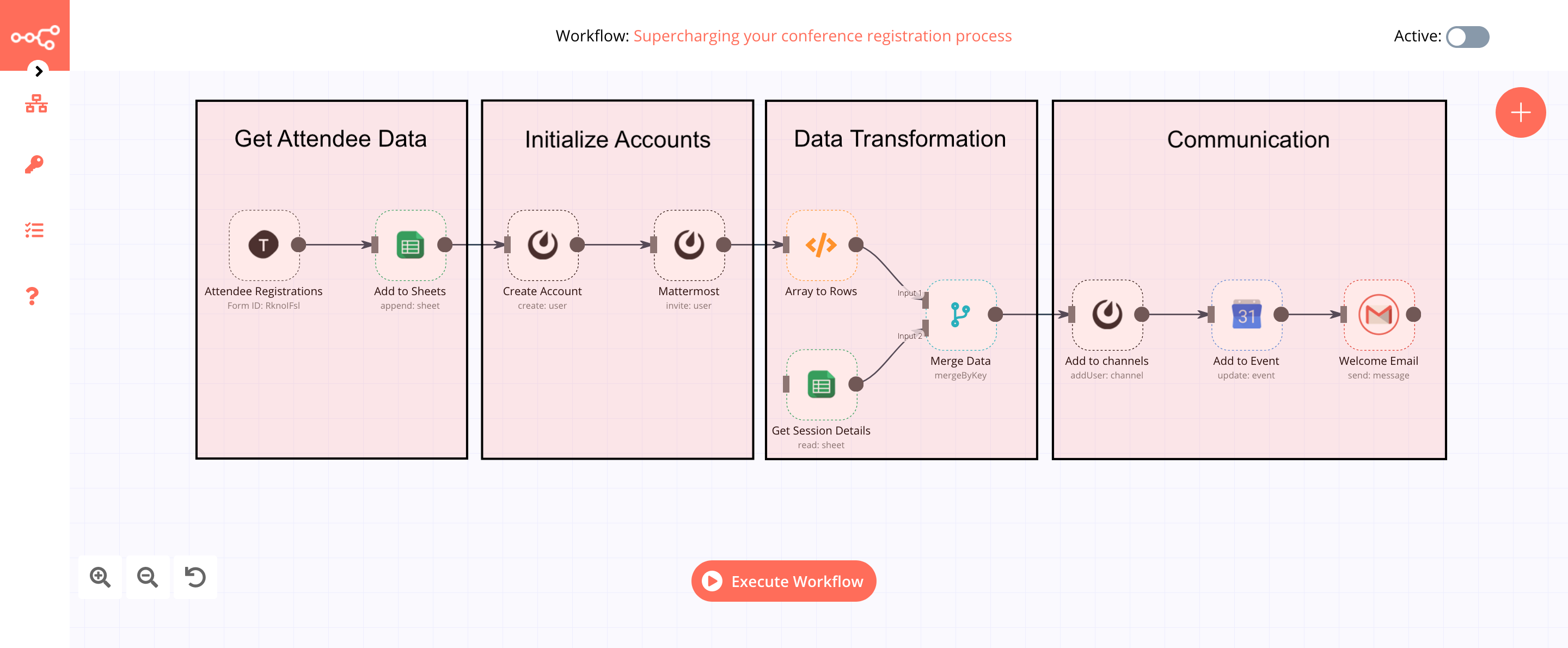 This Mattermost node adds the attendees to the appropriate channels for their sessions.