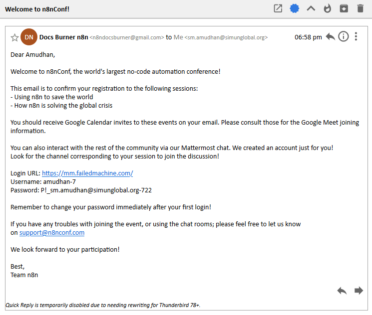 The final stage in this workflow — we send an email via the Gmail node to the attendees. In this message, I made sure to include a summary of the sessions they have signed up for, where to find the joining information and credentials to the Mattermost server.
