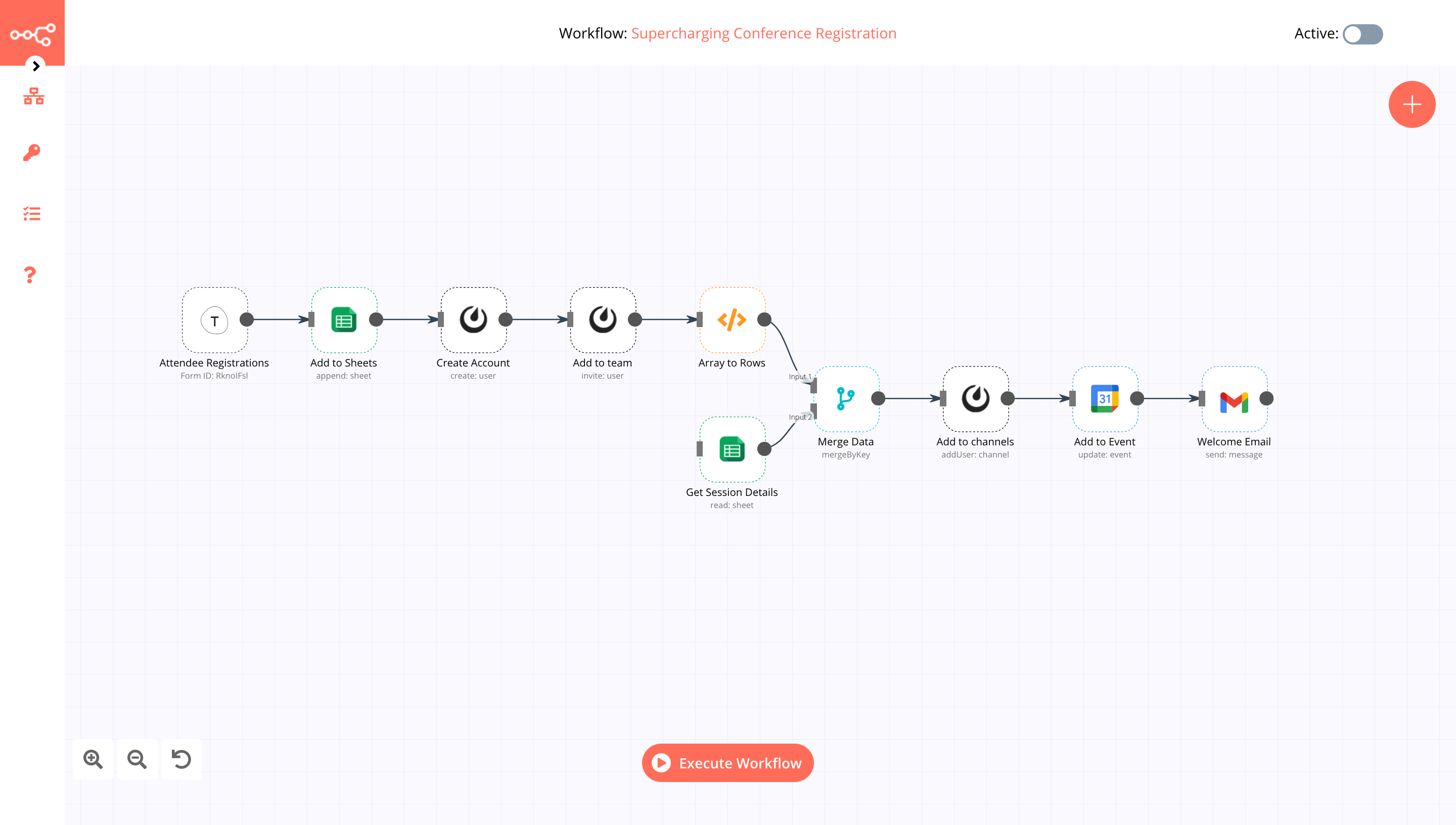 Congratulations! 🎉 You’ve successfully set up a Typeform, Google Sheets, Mattermost and automated the signup process for your conference using n8n to create accounts, send invites, and notify your attendees with a friendly welcome email.